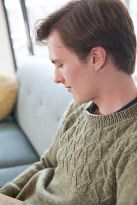 Bayr is a classic men’s pullover (looks good on women too) that highlights a twisted stitch pattern on the yoke. Cleverly using the natural difference of gauges between the Stockinette Stitch body and the yoke, Bayr pullover naturally forms a slightly inset, square armhole. Sleeves are worked from the armhole to cuff.