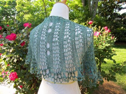 Bayshore is a symmetrical wrap worked in short rows to achieve its length. It is light and lacy and can be worn as a wrap or as a scarf.