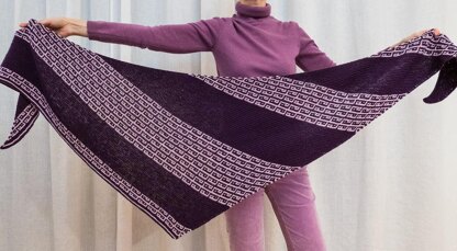 Be Strong is a two-color, boomerang shaped shawl created for fingering/sport weight yarns. Sections of plain garter stitch alternate with mosaic sections in a garter background, making it an engaging, but relaxing knit.