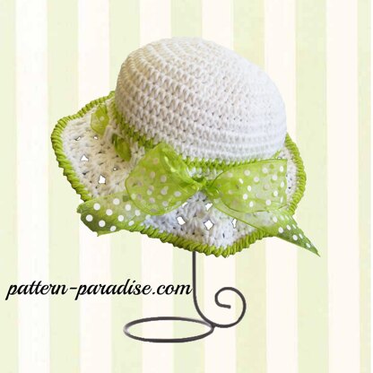 This is an adorable hat perfect for the beach or every day wear. The ribbon tie can be adjusted for the perfect fit. The hat has a little “flounce” but not so much that it will get into little eyes.