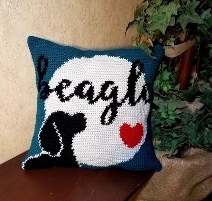 Pattern includes instruction and tips for how to do intarsia crochet, specific instructions for THIS particular pattern and a colored graph. “I Love This Yarn” brand yarn was used for this pattern, however any medium weight (#4) worsted weight yarn with comparable colors can be used. Front of the pillow has the beagle art, the back is plain "antique teal" blue.