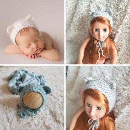This is a pdf knitting pattern, written in English, using standard US terminology, for you to knit a DK weight Bear Bonnet photo prop in sizes newborn to one year.