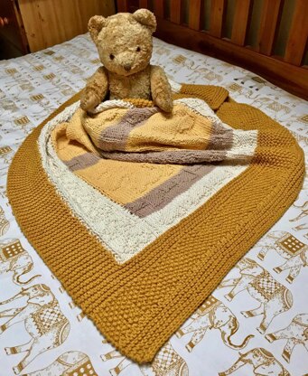 The blanket has shades of gold and yellow through to beige and cream and has three motif teddies on each side. The teddy was drawn from one of my own childhood bears.