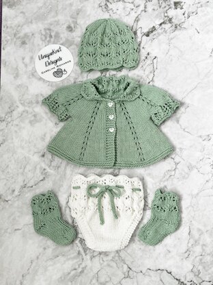 The Cardigan is knitted from the top down on straight needles. The Little shorts are knitted from the bottom up. The Nappy cover is knitted from the top down. The little beanie hat is knitted from the bottom up The little socks are knitted from the top down.