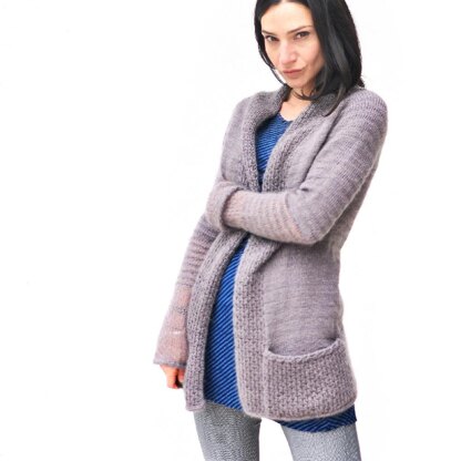 The sloped raglan shoulder gives a natural looking and well fitting shape to the yoke, while accelerated short-rows in the integrated neckband allow for generous draping and fuller volume at the reversible patterned neckline that slowly flows into the hem and pockets and continue in the same texture.