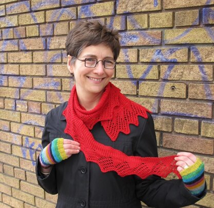 Finished measurements Mitts: hand circumference 14 (15, 16.5, 18, 19, 20) cm, length 14.5 (15, 16.5, 17, 18, 18.5) cm Shawl: one, but adjustable to preference and available yarn. Samples shown are 28-30.5cm deep and 140-150cm long.