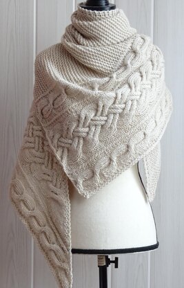 Becca shawl is a contemporary triangular shawl featuring a cable panel surrounded by classic garter stitch. You start knitting with just a few stitches at the right tip, then work your way accross to the left edge, creating the asymmetrical triangular shape.