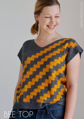Bee Top is worked in the Tunisian crochet entrelac technique. Each element of the top is small enough to place all of your stitches on a regular crochet hook. The top is worked from the bottom up, starting at the side. No seaming is required.
