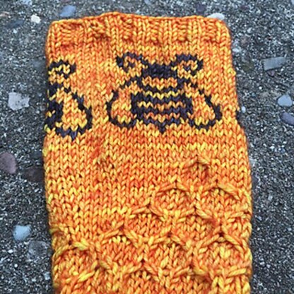 You’ll start with 1x1 ribbing, then work ‘repeating circle’ cables for a bit, and on to the colorwork bees after a short bit of stockinette, ending with 2x1 ribbed upper cuff. and finishing off with the afterthought thumb.