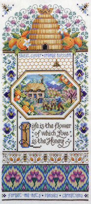 By Sandy Orton. A beautiful Beehive motif graces this sampler from Sandy Orton."Life is the flower of which love is the honey." This rich and colorful design has lots to offer the experienced stitcher. It has a variety of stitches, stitches over one thread and forget-me-nots, carnations, and bees everywhere.
