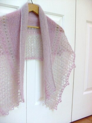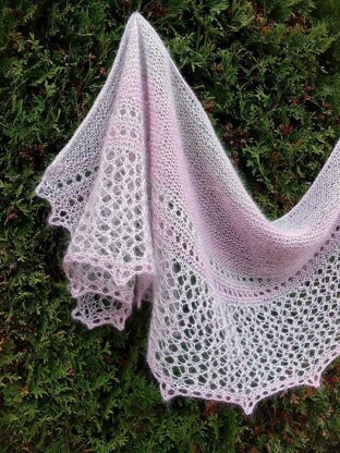 Before Sunrise is a crescent shaped shawl with a soft and lofty look and just enough amount of drape. The sample lace mohair shawl was made with two strands of lace weight yarn held together, one of which is a smooth yarn, to add body and drape, and another one is lace mohair yarn, to add softness and luxurious feel to this accessory. The shawl can also be knit in fingering or sock weight yarn. This shawl design features reversible stitch patterns (eyelets, lace/mesh and garter stitch) that create an equally beautiful fabric on both sides. The shawl is knit bottom up and shaped with short rows technique. By changing the colours of the yarn as you progress or using a gradient yarn to show it off to its best advantage, you create the fabric with stripes and semicircular shapes.