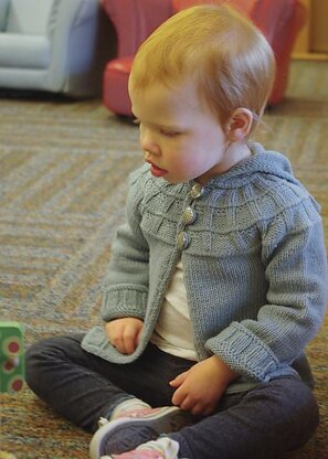 A nearly-seamless children’s coat with a pixie hood, and featuring a circular yoke with rib and welt detail and i-cord edging.