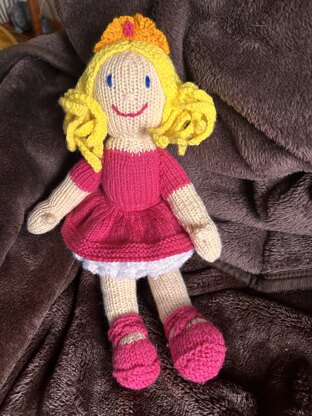 Bella is a sweet ballerina doll, knitted mainly in stocking stitch. The hair is knitted in two pieces, with the curls made along with the two main hair pieces by decreasing at the same time as casting off the stitches. The tiara uses a simple but effective picot cast on pattern, and short row shaping.