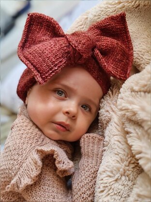**Pattern Overview:**This headband is knitted seamless from one edge to the other lengthwise. Once the first I-cord is complete, stitches are picked up along the edge, and the band is worked in double knitting, resulting in a soft, double layered, reversible fabric. The pattern features a simple decrease before finishing with an I-cord bind-off, giving the headband a neat and polished look. The oversized bow is created by folding the band, making it a quick and satisfying project that requires minimal finishing.