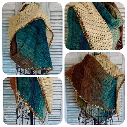 This triangular shawl is crocheted side to side, increasing with the first 12 mini skeins then decreasing with the remaining 12 mini skeins. The textured stitch pattern looks intricate but is simple to crochet. This shawl would work well with alternative colour schemes.