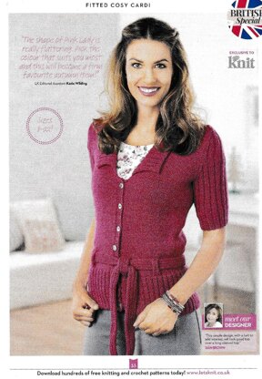 This is a pattern for a Belted Cardigan, originally published in Lets Knit. It is in stocking stitch with rib sleeves, edges, collar and belt. The yarn has now been discontinued. Any yarn knitting to the standard tension 22/28 can be used. Photos Lets Knit.