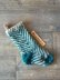 The stocking includes mosaic colorwork, German Short row heel, Braid feature, and a kitchener stitch finished toe. It is knit from the top down.