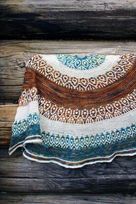 BEREN is semi-circular colorwork shawl. There is no stranding - you work with just one color in every row. Techniques used: garter, and slipped stitches (mosaic knitting). You can use up to 5 colors. I used three: 70 g of white, 40 g of each brown and green. The prototype is 145 cm wide, and drops 56 cm. I used US size 5 needle for garter and slipped stitches. You might need larger needles for the colorwork, as it is denser and doesn't stretch as much as garter.
