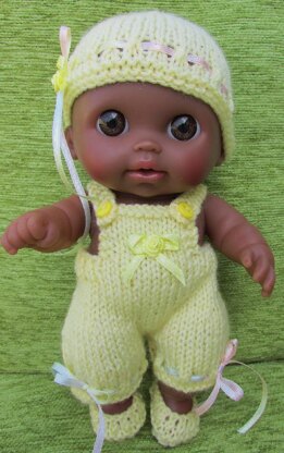 Really easy to knit outfit for a Berenguer Li'l Cutesies doll. Instructions are for a playsuit with crossover straps, hat, headband and slippers. The playsuit can be made with longer legs or shorter legs. The longer legs have eyelet holes for ribbon. Uses DK yarn and 3mm needles. Written in UK terms.