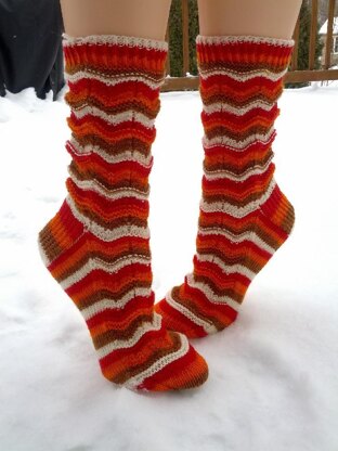 These socks use a chevron pattern divided by horizontal "welts" of garter stitch, often known as "welting fantastic." The pattern creates ripples that will showcase a self-striping yarn with wide (5-8 rows) regular stripes, but will also be striking with a non-regular striping, solid, or tonal yarn.