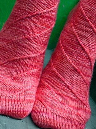 These easy socks play with the simple texture of purled and knitted fabric. Twisted stitches add another dimension that makes the texture pop. The mirrored design from right sock to left keeps it entertaining when working the second sock.