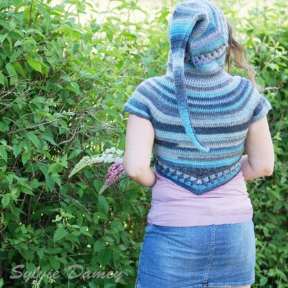A fun cropped bolero for the summer, with a super long hood and bobbles... Fun to make and fun to wear !