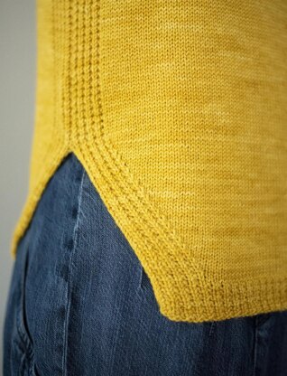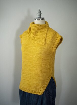 This vest, featuring a slanted cut-out on one side and wide long turtleneck collar with a slit, is a study in balanced asymmetry. The body of the vest is worked in Stockinette Stitch with Garter Rib borders and hem. The collar is also worked in Garter Rib.
