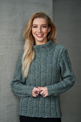 Notes: The pullover is worked back and forth in separate pieces and seamed. The cable pattern continues on the collar which is worked in the round with an interfacing part.