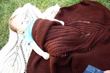 Baby Blanket with a big leaf motif. The instructions are both written out line by line and charted. Knit in acrylic, this blanket can be machine washed and once it has been steam blocked, will not need to be blocked again. Perfect for a baby gift!