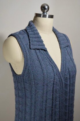 CONSTRUCTION: Knit flat from the bottom up in one piece to the armholes and then separated for the fronts and back. The ribbed trim at the armholes and collar band (with optional buttonholes) is worked at the same time as the body. The shoulders are shaped with short rows and joined with 3-needle bind off. Stitches are picked up at the V-neck for the ribbed collar.