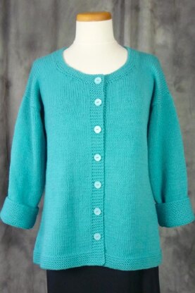 A classic cardigan in Stockinette stitch with garter stitch borders. Instructions provided for worsted and chunky weight yarns.
