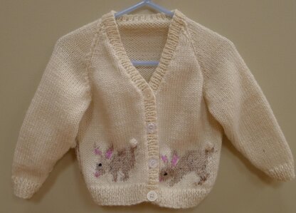 This little cardigan and hat is ideal for the colder months. Knitted in 8ply (DK) it features three dear little Bilby’s hopping around the lower border of the cardigan and embellished by a mohair bobble tail. Each Bilby is slightly different. A 8ply hat with mohair bobbles makes up the set and is sure to become a firm favourite. Wind off separate colours for each Bilby so that there is no danger of pulling the yarn too tightly across. Once the graphs have been knitted this raglan style cardigan knits up quickly and is not difficult. Bilby's are an Australian native but you can just as easily think of them as rabbits. I think they will be just as popular.