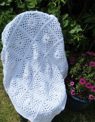 Billie Baby Blanket Crocheted in DK Cotton and a 4.00mm hook, the baby blanket is made up of 25 square motifs. The square is designed with a popcorn stitch center and a treble crochet granny stitch surround which results in a textured fabric for the blanket.