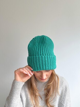 Billie Hat—a ribbed beanie with a folded brim, made for a relaxed fit that’s not too snug. This soft stretchy ribbed hat pattern is offered in baby, child and adult sizing, the pattern is designed to fit the entire family. The hat is worked flat with a yarn over slip stitch which imitates knit-like ribbing.
