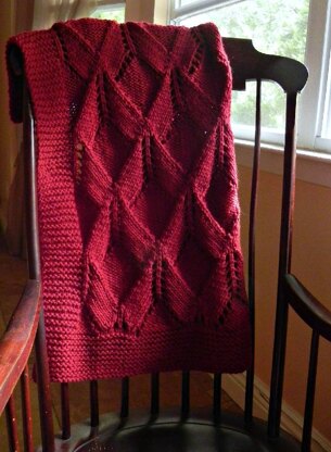 Bino is a boldly delicate lace and garter stitch blanket. Originally intended for baby, it is simple and elegant enough to be used as a throw in your living space as well. Constructed with large needles and bulky wool, it can be completed quickly. Both written and charted directions are provided.