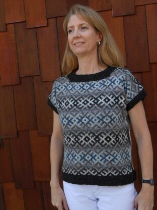 This simple T-shaped sweater is knit in the round in one piece with steeks at the neck and cuffs. The hem and bands are knit with the yarn held double so they have some texture.