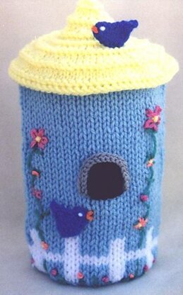 Very cute way to save money! Knit the “sleeve” house to fit over an empty oatmeal box. Trim with scraps of yarn. This is fairly easy to knit. Then you add easy knit birds and embroider a few flowers to decorate. Birdhouse “rooftop” lifts off so you can add money to your bank. A good way to store “secret” items too. Uses worsted weight yarns, knitting needles size US # 4, and # 7. Bank finished is about 11 Inches tall with roof.