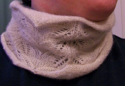 A cashmere cowl to cuddle your neck or worn as a headband is always a great idea. Here, the stitch reminds me of birds in flight … over a field of snow. This lace pattern, a repeat of 27 stitches over 10 rnds, is easy to memorize, making the knitting smooth and easy … and knitting it in cashmere means your hands are treated to the softness and beauty of the fiber while knitting.
