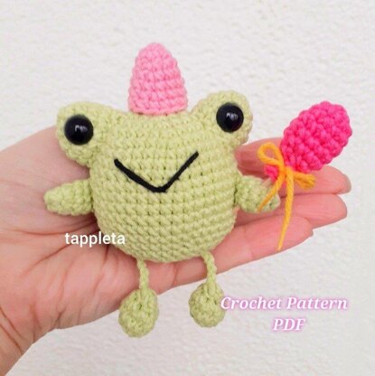 Cute amigurumi Birthday Frog with hat and balloon. Pattern PDF. A very quick and easy Holidays Project!. Attach a Keyring to it and convert it to a cute Keychain! This pattern is suitable for those who have crochet skills for beginners and know the magic ring, single crochet, increase, decrease. Pattern is in standard American terms. Size approx. 3 1/2" (9 cm.) You will need: - cotton blend yarn ( YarnArt Jeans) - hook B (2 mm.) - safety eyes 10 mm. - polyester fiberfill - metal key ring - needle, scissors You are free to sell the finished item made from this pattern. PATTERN CAN"T BE SOLD!!! Happy crocheting!!!