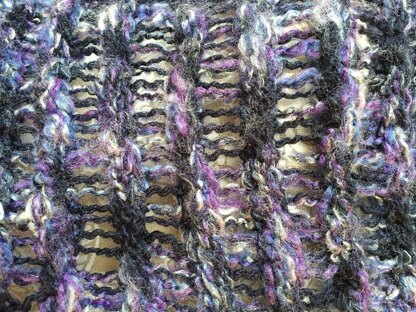 This wrap is double knit on Authentic Knitting Board's 28" knitting board. The sample used 745 yards of Red Heart Artesano yarn in Moonstruck, but unfortunately this yarn has been discontinued. I honestly think any medium worsted weight yarn that has a soft touch and flowing drape would look beautiful. In fact, I think a solid color would do a much better job at highlighting the different stitches and textures of the wrap than the yarn I chose.