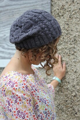 Black Tea is a soft, slouchy hat featuring a lovely round cable repeat. It's accented by one fishtail cable. The pattern is simple, but the cables are strong and unusual enough that they make an impact. I like the effect when the fishtail is worn a bit off to the side in front.