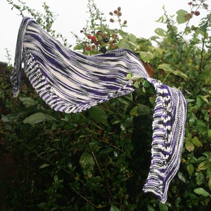 The pattern is especially suited to colourful variegated yarn as the changing row length of the main body and the shorter rows of the border allow random pooling to occur where it will. The garter stitch body forms a delightfully squishy scarf with a simple but effective edging.