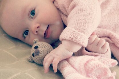 Sample bear used DK weight yarn for the head and fingering weight yarn for the blanket.