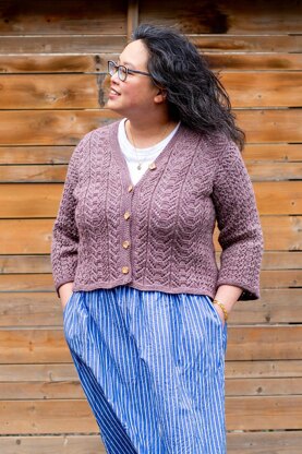 A pretty lace cardigan worked in a DK-weight merino silk blend, with a deep V-neck and three-quarter sleeves. The body is worked flat in pieces, which are seamed together before picking up for the sleeves and working them in the round. Lace chain columns are mirrored around the body and finished with simple garter stitch edgings.