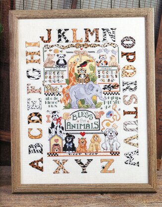 Designed by: Linda Gillum. Our little one will learn about their favorite animals while learning their ABC's with this fun sampler. Features "bless the animals" message in the center. Makes an unforgettable gift for baptism, baby shower, new baby, or anyone who loves animals.\n