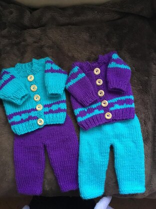 This great little outfit has a pair of trousers and jacket with contrast pattern on it. Worked flat with a few seams to sew,
