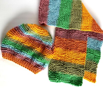 A very toasty warm set for anyone, in pretty bright colors of self striping yarn. This is an easy pattern to knit, and you may want to make a second scarf and hat set for a wonderful gift. Fits older children, to teens to adults, everyone will love wearing this nice warm set. You can knit it in plain colors too, and still have a wonderful texture effect. Put this pattern in your library for when you need a gift that is just a bit different than everything else and mark it easy to knit too. Worsted weight yarn, knitting needles, US # 9 and # 7