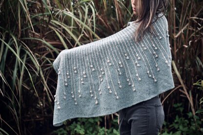 Blooming in the Mist is a crescent shape shawl worked from one side to the other using short row technique. The seed stitch background mimics the texture of mist, while everything goes obscured. And the bobbles and knit stitches are used to form the shape of plants or water drops.