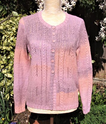 A lovely light-weight cardigan with patterning on the fronts and centre of sleeves. The pattern on the fronts is divided into blocks of the mock cable and eyelet pattern with a subtle wide broken rib at each side. The broken rib is also worked on the back and sleeves. The 2x2 rib make neat borders to this cardigan.