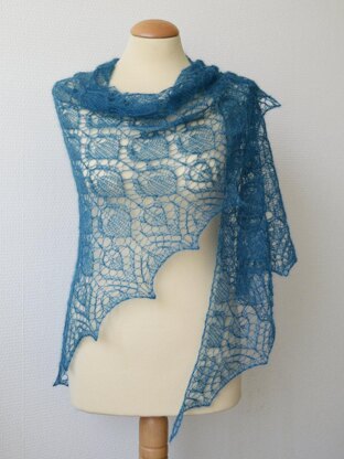 You know that gorgeous blue-green that male ducks have? That is what this lovely lace-weight mohair yarn reminded me off. What better way to show it off than with all-over lace? Of course, this shawl can also be knit in fingering-weight yarns; just adjust the needle size a bit!
